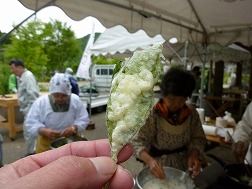 俺がぶらぶらしてたらテントの中のおばちゃん今お茶の葉のてんぷら揚げるから食べてって。